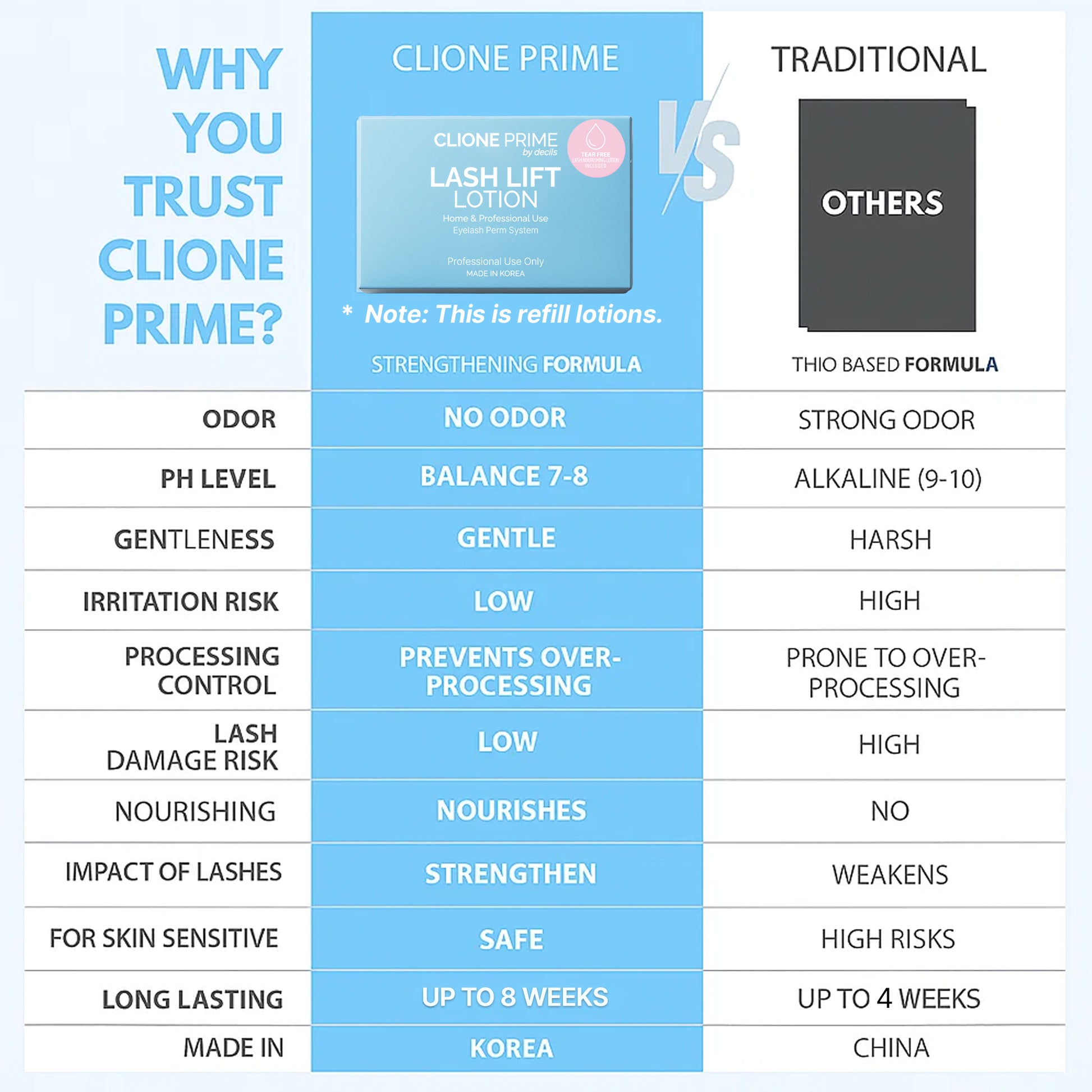 Unlike traditional bulk lotions that oxidize quickly and risk cross-contamination, our single-use sachets ensure peak freshness and hygiene. Plus, our formula is enriched with conditioning ingredients—not just chemicals—so your client’s lashes look and feel healthier after every treatment.